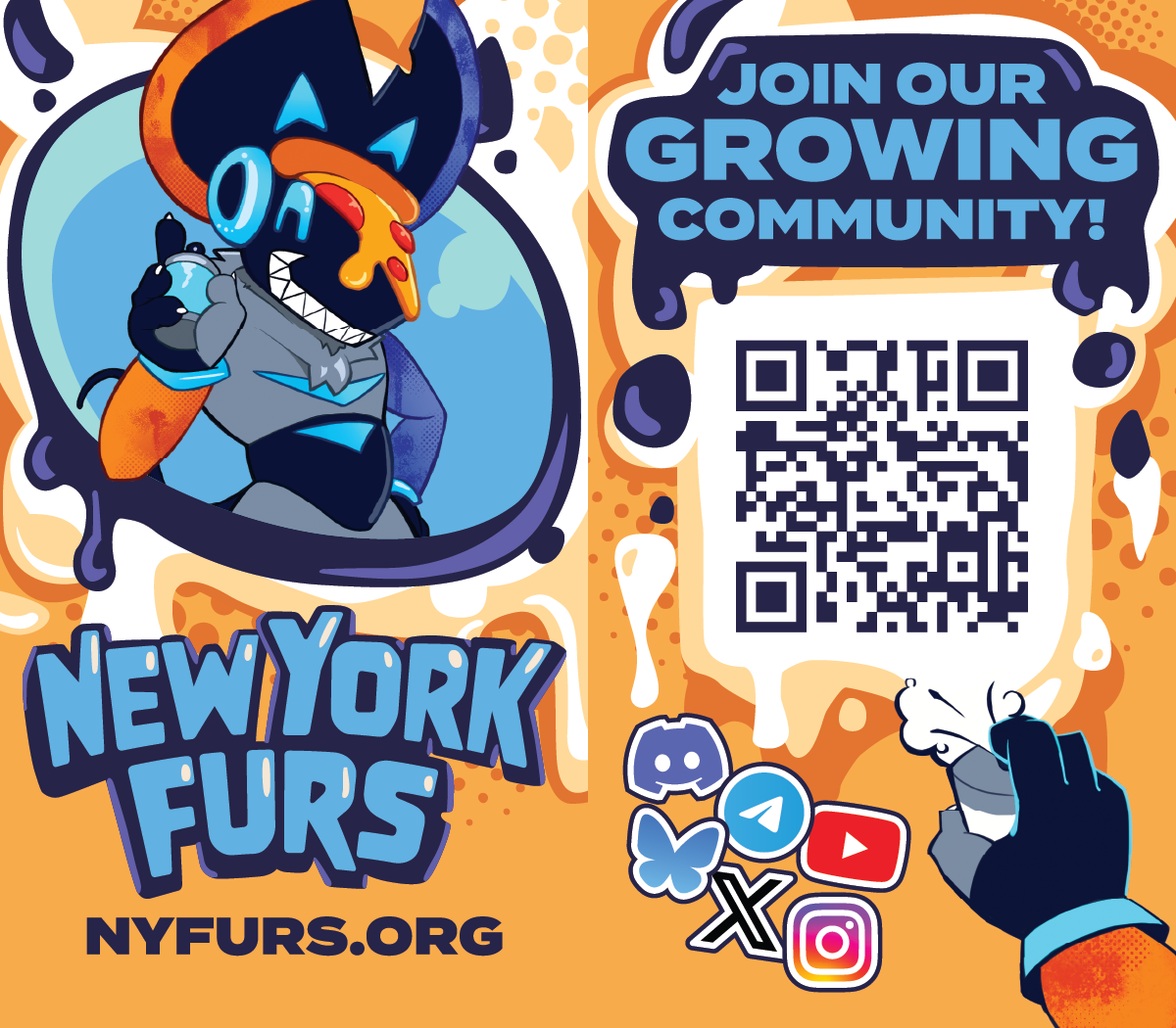 I volunteer my spare time to help create graphics for New York Furs, creating original illustrations or working with other artists as a graphic designer. NYF is a non-profit collective group of NYC furries who work to create a local community of fellow furries throughout the tri-state area. They work to arrange meet-ups and activities for people to have a chance to make new friends and expand the local furry community.